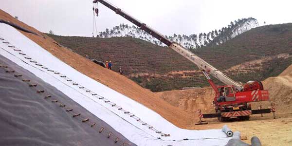 固体废弃物垃圾填埋一般是利用山坳、开挖过的矿山等进行填埋防渗。填埋场的防渗层上面都是要填埋成千上万吨的垃圾,所以一般采用1.5mm以上厚度的防渗膜,幅宽也应大于6米,减少焊接缝。因为实践证明,填埋场的渗漏70%出现在焊接缝。坡面可采用糙面的防渗膜,增加摩擦系数,使可用容积达到最大化。